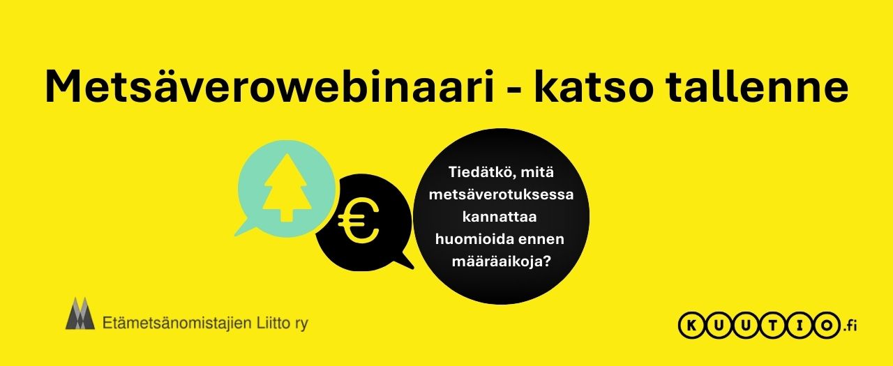Metsänomistajan veroilmoituksen määräaika lähestyy. Tiedätkö, mitä metsäverotuksessa kannattaa vielä tarkistaa ennen palautusta? Kuutio ja Etämetsänomistajien Liitto järjestävät maksuttoman metsäverowebinaarin 10.2. klo 18, jossa käydään selkeästi läpi metsäverotuksen perusasiat, ajankohtaiset muutokset sekä viime hetken vinkit veroilmoituksen täyttämiseen.