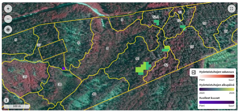 “Sään ääri-ilmiöt, kuten kuivemmat ja kuumemmat kesät, ovat lisänneet hyönteistuhojen riskiä. Siksi haluamme tarjota Kuutiossa ominaisuuden, jonka avulla metsän hyönteistuhoista saa tietoa ajoissa. Lisäksi yhä useampi metsänomistaja asuu eri paikkakunnalla kuin omistamansa metsät, joten tilannetta on tärkeää pystyä seuraamaan myös etänä,”