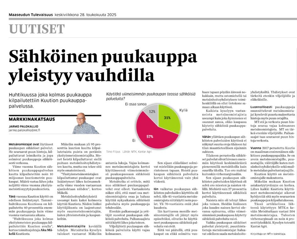 Läs artikeln om hur elektronisk virkeshandel blir vanligare genom att trycka på knappen nedan. Artikeln visas i ett eget mellanblad och kan läsas endast om du har en prenumeration på Maaseudun Tulevaisuus.